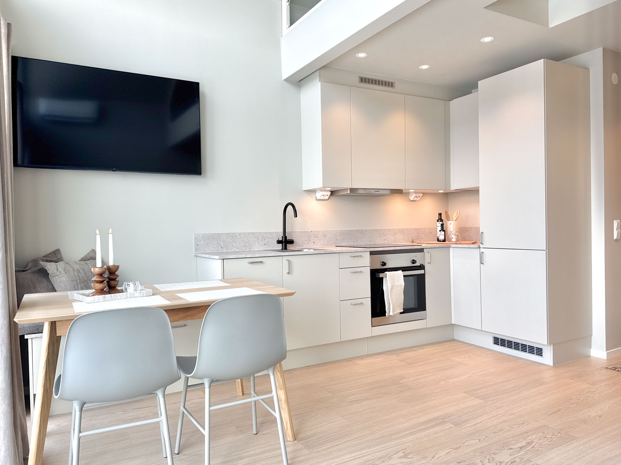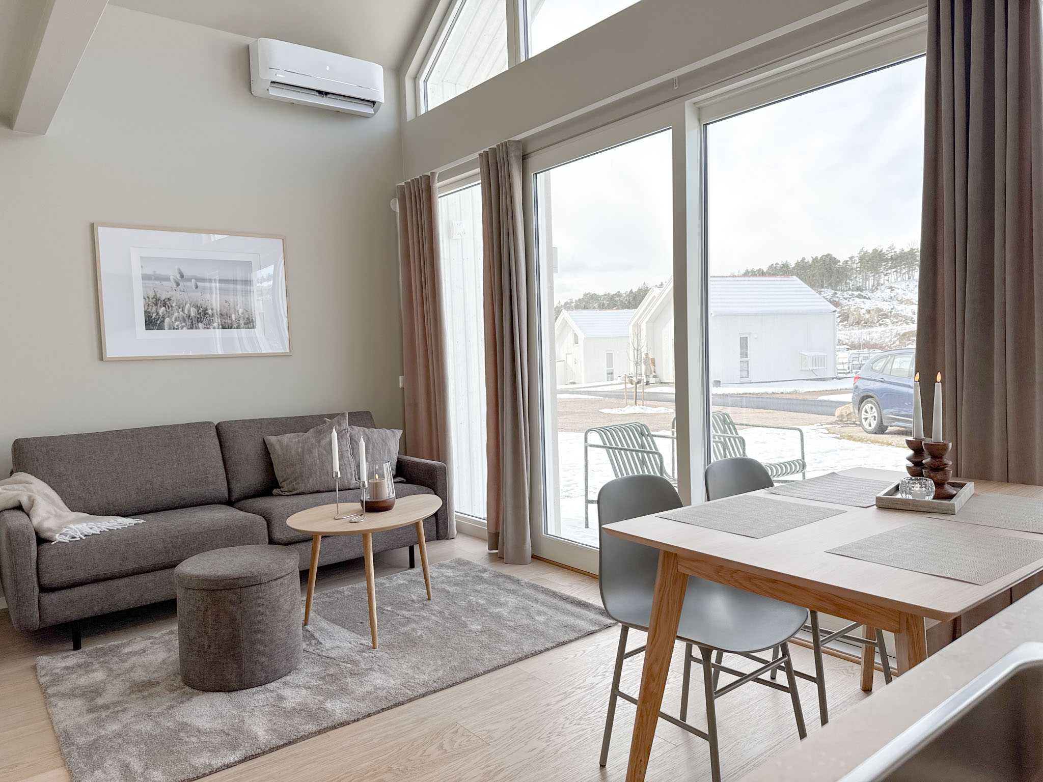 Stuen er hjertet i hyttene med sin tidløse møblering og romslige takhøyde, som slipper inn rikelig med lys. Et perfekt samlingspunkt for å nyte sene sommerkvelder i sofakroken foran tv-en. Ovenfor stuen finner du et godt utstyrt kjøkken, med tilhørende spisegruppe der du får plass til en familie på 5. I andre etasje finner du 2 sovesofaer som er både sofa og seng med plass til 2 barn i hver, og på hovedsoverommet er det en god 180cm bred seng – til sammen 6 sengeplasser. På den romslige terrassen foran hytten er det en solfull sone for avslapning, måltider og hygge.