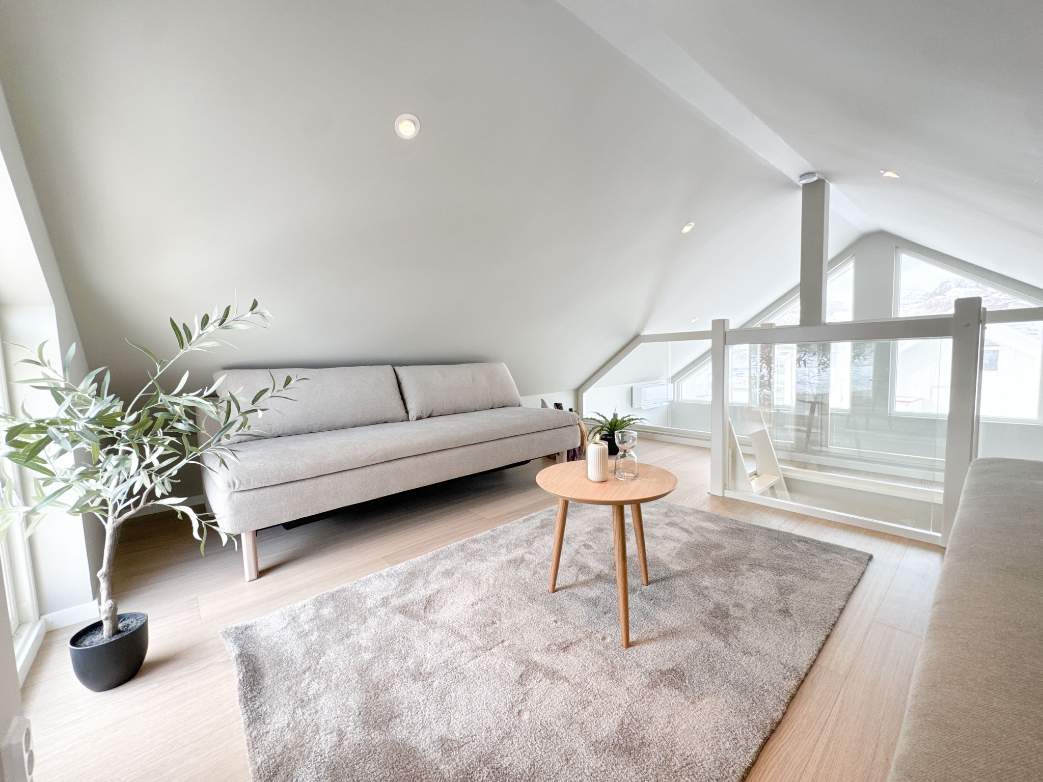 På loftet er det romslig med to sovesofaer og god ståhøyde i midten. Kom og opplev hyttene selv!